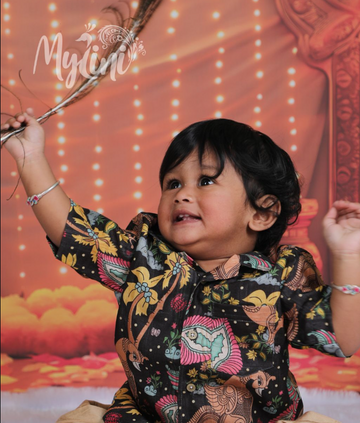 Green Floral Kalamkari Baby Girl Traditional Dress with Kanjivaram Border | Tie-Up Frock